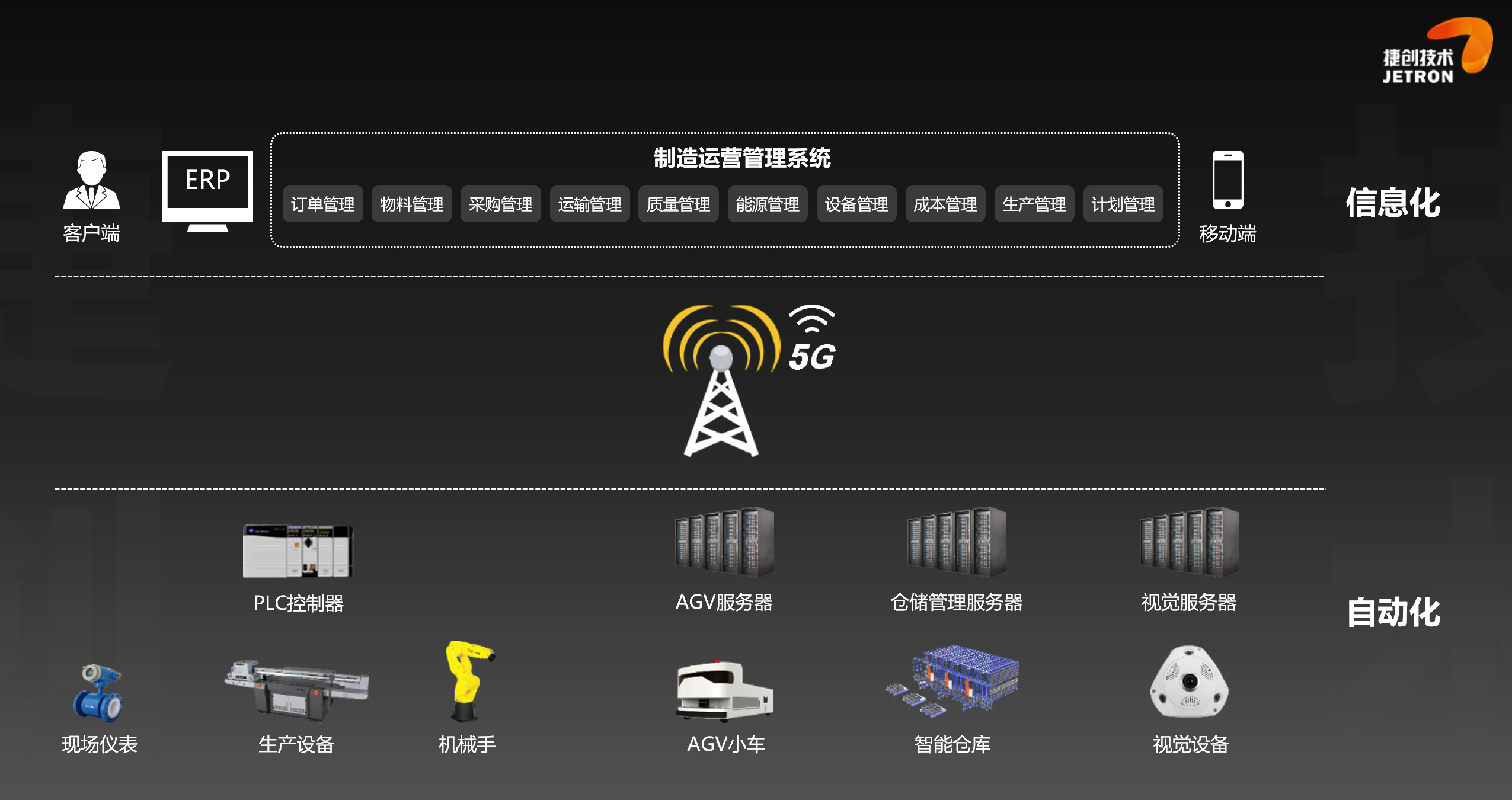 The unmanned factory is the future vision of the manufacturing industry. 5G technology promotes the deep integration and innovation of IT, CT and OT, making this a reality. Jiechuang Technology's 5G+MOM unmanned production system builds a 5G future factory and helps industrial enterprises to transform and upgrade to a true digital, networked and intelligent. Personalized customization, flexible production, and networked collaboration are all possible in the 5G future factory. 5G leads the era and creates a smart future together.