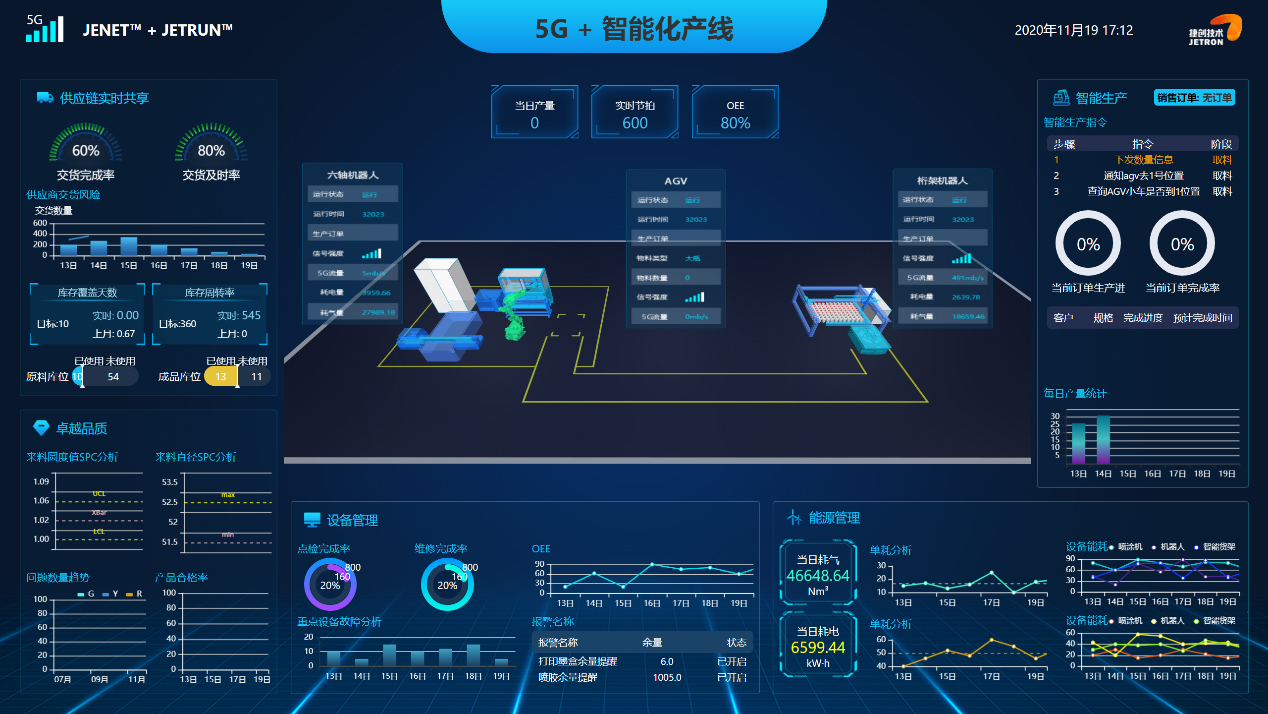 The 5G+MOM future factory unmanned production line simulates the whole process of automated production in a smart factory, and is also an application of the integration solution of automation, 5G, and informatization. The production line consists of smart shelves, AGVs, robots, glue sprayers, and UV printers. The field equipment transmits data through the JENET 5G intelligent industrial gateway independently developed by JETRUN and the JETRUN-MOM system deployed in the cloud to realize real-time interaction between the MOM system and the equipment. Customers can "place an order" with one click on their mobile phone or tablet to conduct personalized customization. The JETRUN-MOM system automatically arranges production, manufacture, shipment and distribution after receiving the instruction.