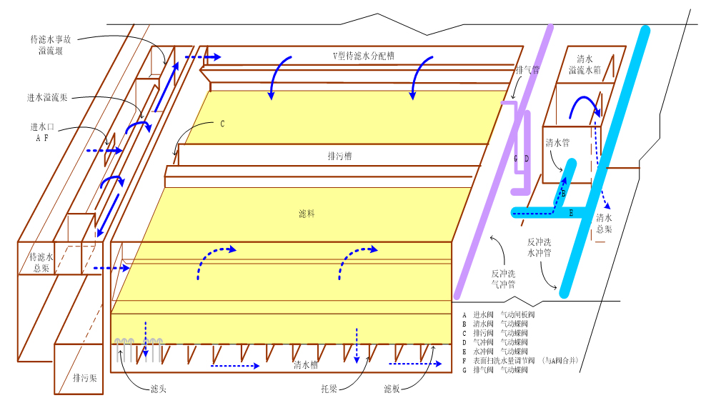 1. V-type filter is a kind of gas-water backwashing fast filter, and its technological process is as follows: