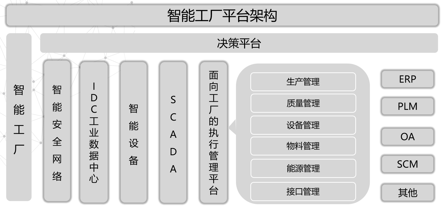 (Summary description)MES (Manufacturing Execution System) is the focal point for the implementation of digital smart factory planning, and it is also the core and key to the construction of digital smart factory. MES is a production information management system oriented to the workshop executive layer. It is connected to the ERP system on the top and PLC program controllers, data collectors, barcodes, testing instruments and other equipment on the site.